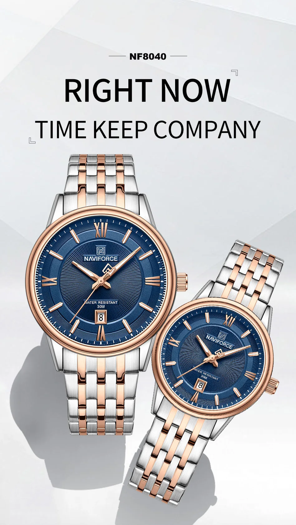 2024 New Fashion Trends Style!! model:naviforce Nf8040 movement: Quartz Calendar Movement gender: Male / Men And Female / Women And Lovers style: Fashion & Casual & Sport & Business dial Window Material Type: Hardened Mineral Glass band Material Type: Stainless Steel clasp Type: Double Clasp specifications(men / Women) : --Dial Diameter: 40mm / 30mm --Case Thickness: 10.5mm / 9.5mm --Total Length: 245mm / 220mm --Lug Width: 20mm / 14mm --Strap Width At Buckle: 18mm / 14mm --Weight : 96g / 63g feature: 30m Waterproof, Shockproof, Date Display description: 100% New With Tag And High Quality comfortable Stainless Steel Band Fashion Lovers Watches
